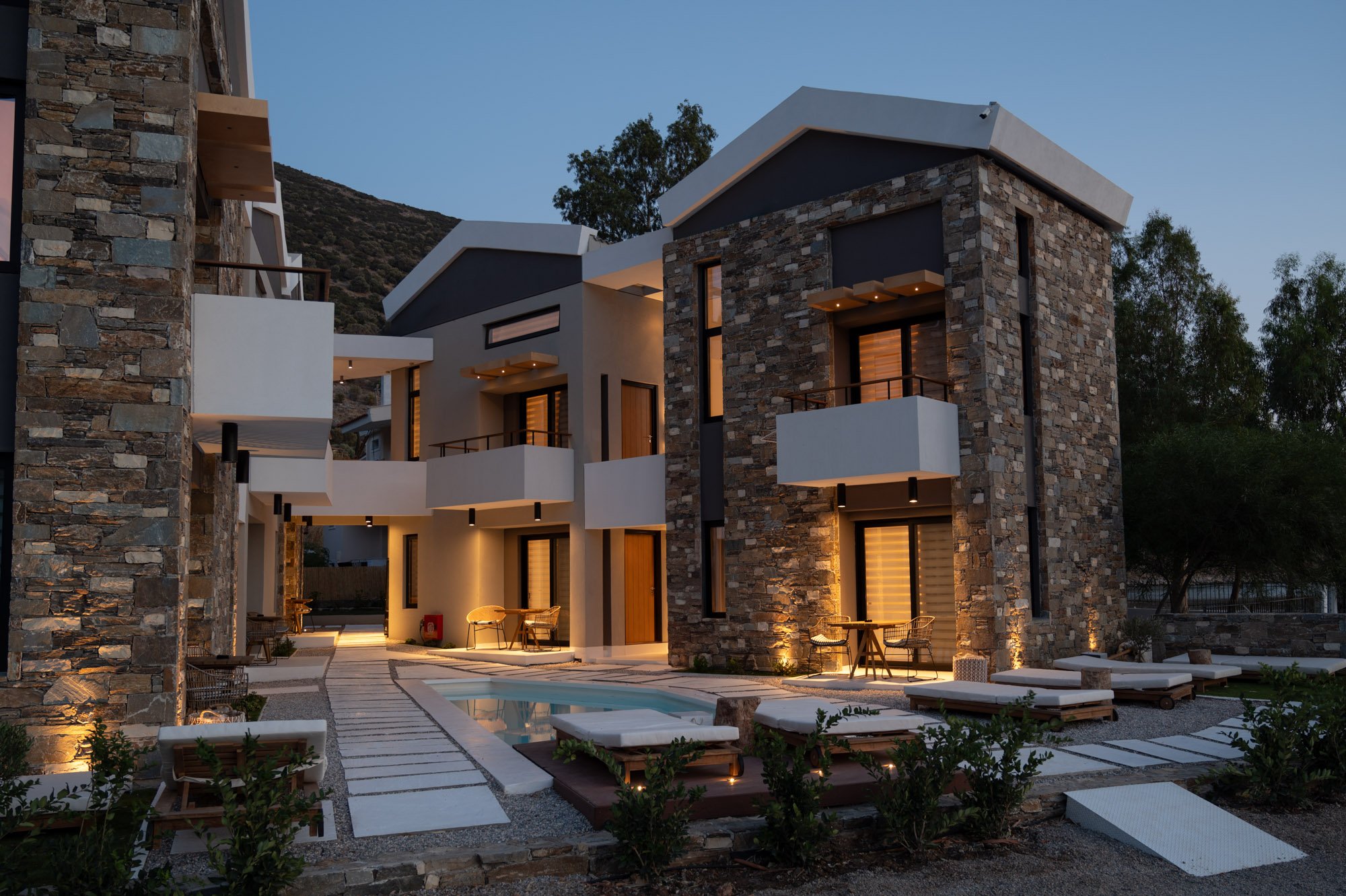 The concept of the property is a harmonious blend of wood, stone, and nature. The hotel features boho-chic designed interiors, with a small swimming pool at the center of the complex.